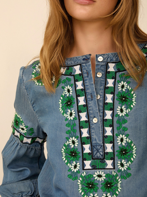 Blusa en tejido denim con bordado floral a contraste. Cuello redondo con botones de nácar.