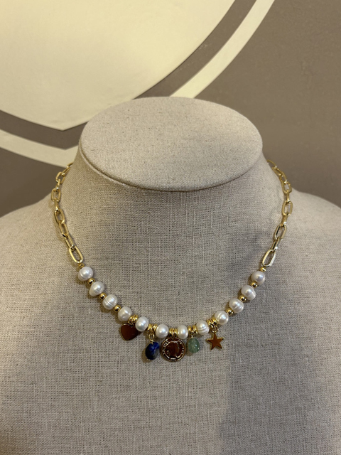 Collar corto de perlas de río con varios adornos centrales