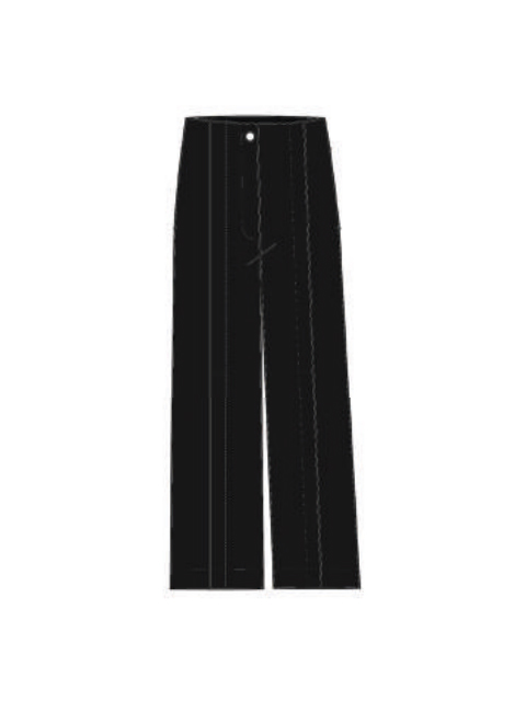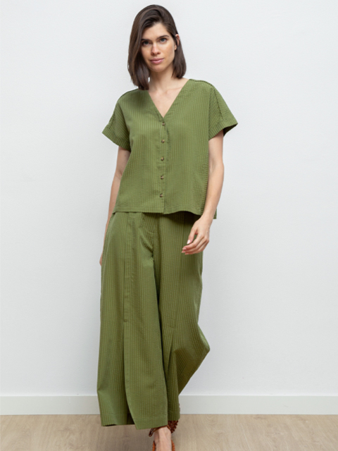 Pantalón de tejido haciendo rallita al tono. Corte recto y ligeras aberturas frontales.
