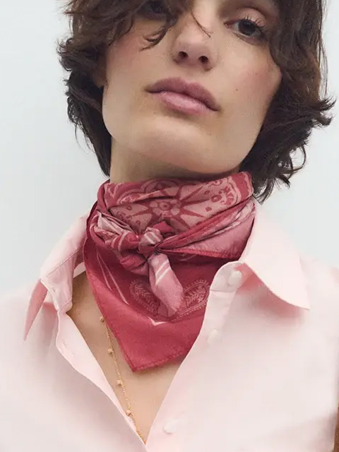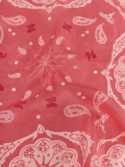Pañuelo de 100% seda. Con estampado paisley en tonos rosas. Medidas: 60 x 60 cm.